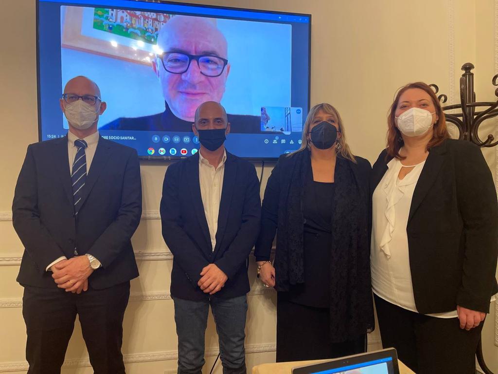 da sinistra, Marco Rizzato Dirigente ARAN, Giovanni Pelliccia coordinamento AIMON Lombardia, Antonella Luci Presidente AIMON e Barbara Guidolin Senatrice M5S. Inquadrato nel monitor Giuseppe Ciaurro segretario nazionale AIMON