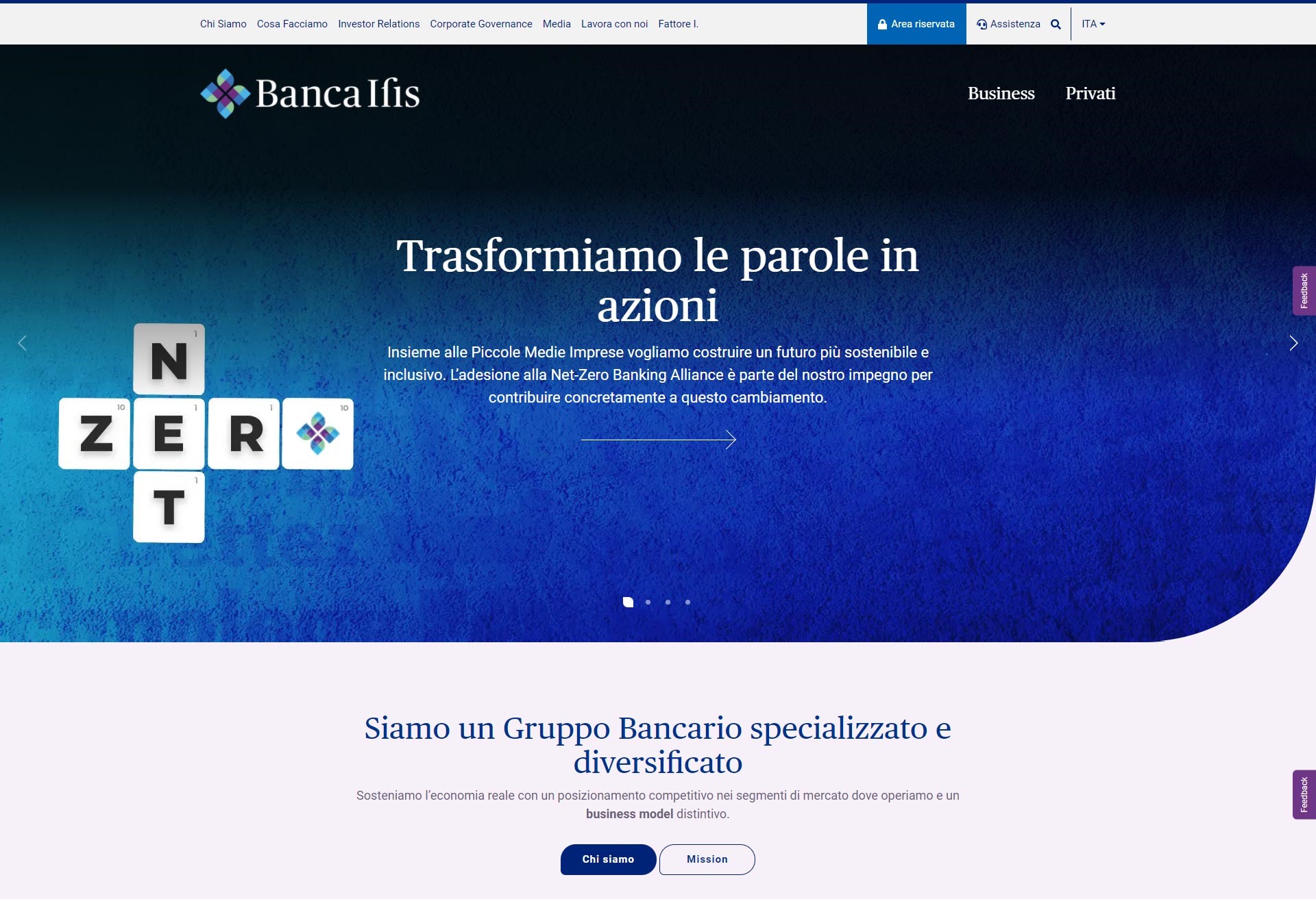 Il sito web della Banca, www.bancaifis.it, rinnovato e rilanciato nel 2020 nell’ambito dell’operazione di rebranding di Gruppo, è oggi uno strumento per lo storytelling e il business immediato, uno strumento in continua evoluzione per comunicare l’identità dell’azienda ma anche un’agile porta di accesso a tutta l’offerta commerciale.
