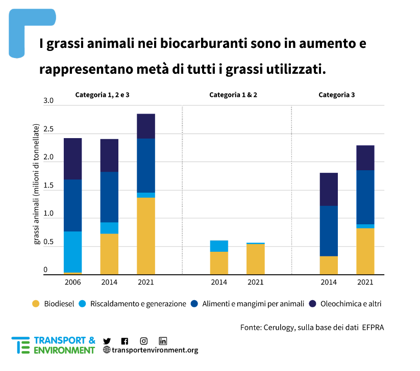 C’è un significativo rischio, inoltre, che i grassi animali di categoria 3 (di qualità superiore e impiegati tipicamente in industrie a maggior valore aggiunto) vengano etichettati come di categoria 1 e 2 per poter essere utilizzati nel settore trasporti e beneficiare di un doppio incentivo economico.