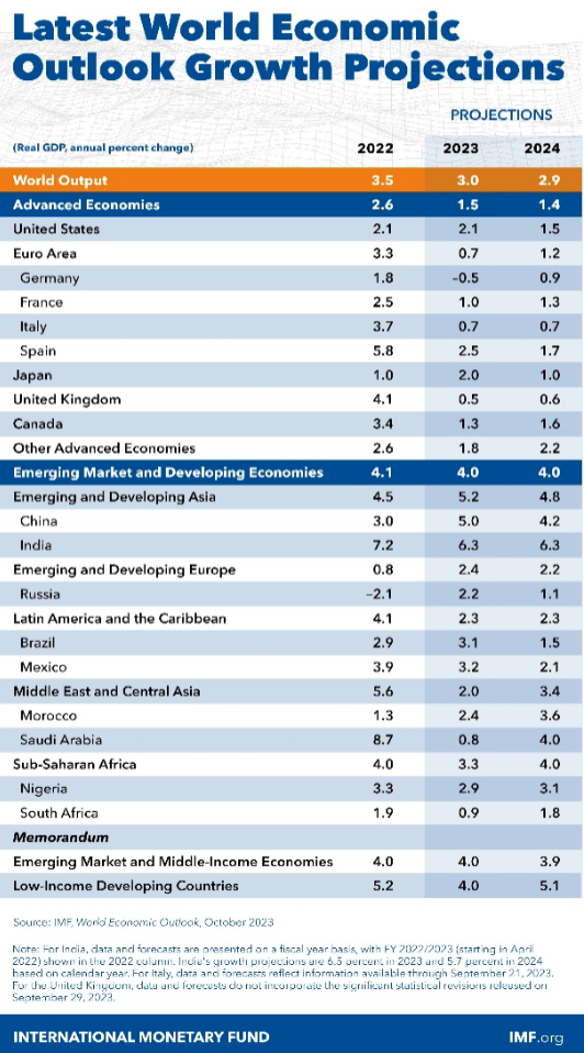 Le proiezioni di crescita economica per il 2024 da parte del Fondo Monetario Internazionale (attenzione: sono di ottobre 2023, non ci sono proiezioni più recenti pubblicate) sono le seguenti: