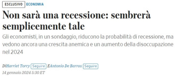 Ovviamente i redattori stimano sulla base dei dati a loro disposizione alla data dell’estensione. Se i futuri dati dovessero evidenziare un crollo nella stima dell’occupazione ovviamente cambierebbe ogni supposizione. Nell’articolo si legge che da un sondaggio fatto dalla testata su una platea di economisti, le probabilità di una recessione scende al 39%. Rispetto al 48% di probabilità ipotizzato dai medesimi economisti intervistati ad ottobre 2023.