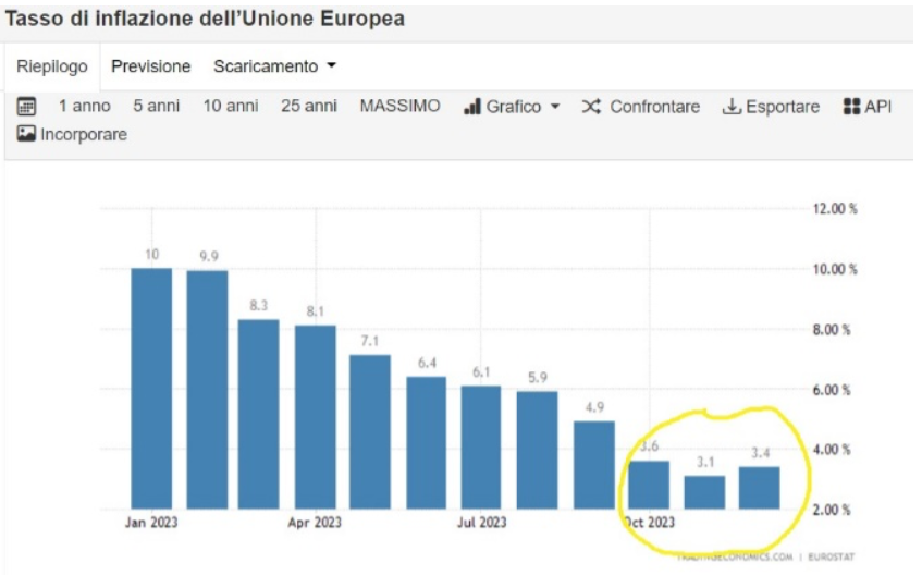 Per confermare lo scenario attuale – semplice raffreddamento ma sostanziale tenuta dell’economia a pur eccessivi stimoli negativi – si deve prestare attenzione ai fenomeni che potrebbero far saltare questo debole equilibrio. Uno fra tutti è tecnicamente noto come “bullwhip effect” – effetto frusta -. Una ripartenza del fenomeno inflattivo dopo un primo segnale – potenzialmente sovrastimato – di un contenimento del fenomeno inflattivo stesso. Questo fenomeno – per gli appassionati di storia dell’economia – accadde nel ciclo inflattivo dal 1974 al 1982. Dopo una prima contrazione dell’inflazione, nel 1977 è ripartita arrivando a tassi di interesse oltre il 20% (i boomers non possono averlo dimenticato). L’effetto frusta è quello che non ci si deve augurare mai! A tale proposito, la Lagarde è stata piuttosto chiara sottolineando che non ci saranno nuovi rialzi dei tassi a patto che non ci siano nuovi shock. Però, analizzando gli ultimi dati Eurostat…