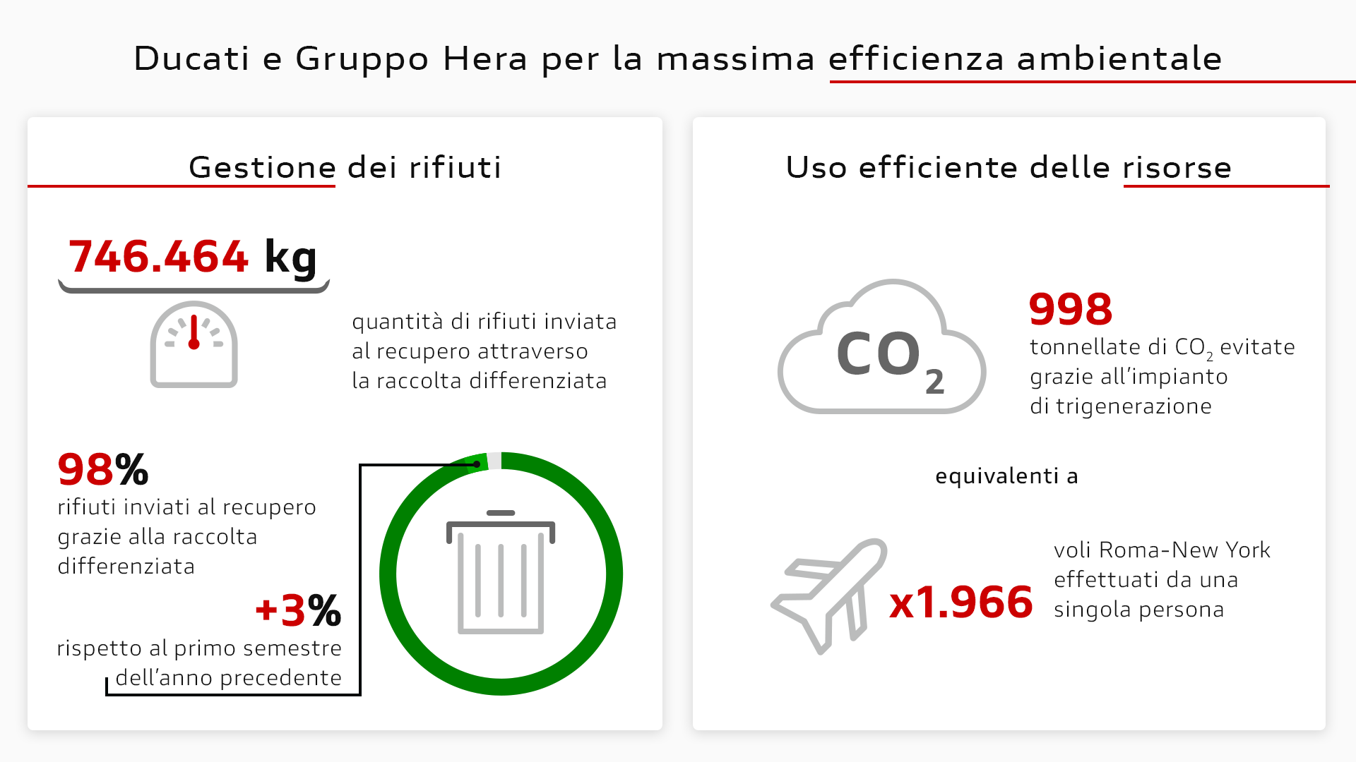 - Grazie alla collaborazione tra Hera e Ducati, nei primi sei mesi del 2021 il 98% dei rifiuti prodotti nello stabilimento di Borgo Panigale è stato avviato al recupero