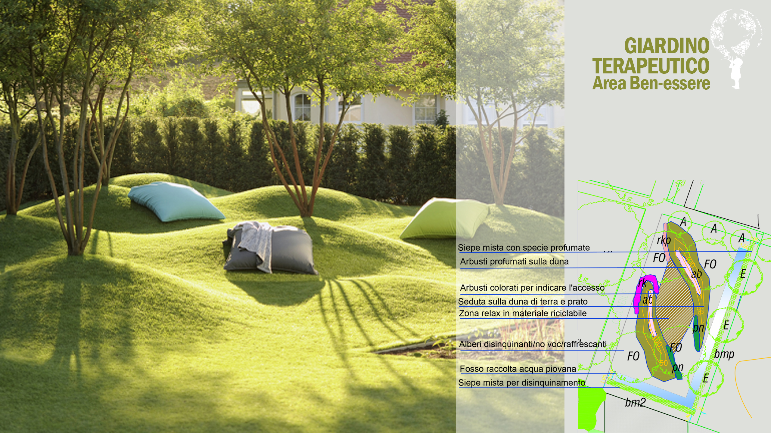 Altri interventi a favore dell’incremento del “patrimonio naturale” sono in corso d’opera. Uno fra questi riguarda il giardino terapeutico che sarà arricchito di 10 piante, 200 arbusti e 400 mq di prato accuratamente selezionati. La nuova area del ben-essere, attigua al Centro Servizi con il suo eco-bistrot, la palestra e il bio-market, consentirà a tutti gli abitanti di Ecovillaggio e non solo di rilassarsi rimanendo a contatto con la natura.