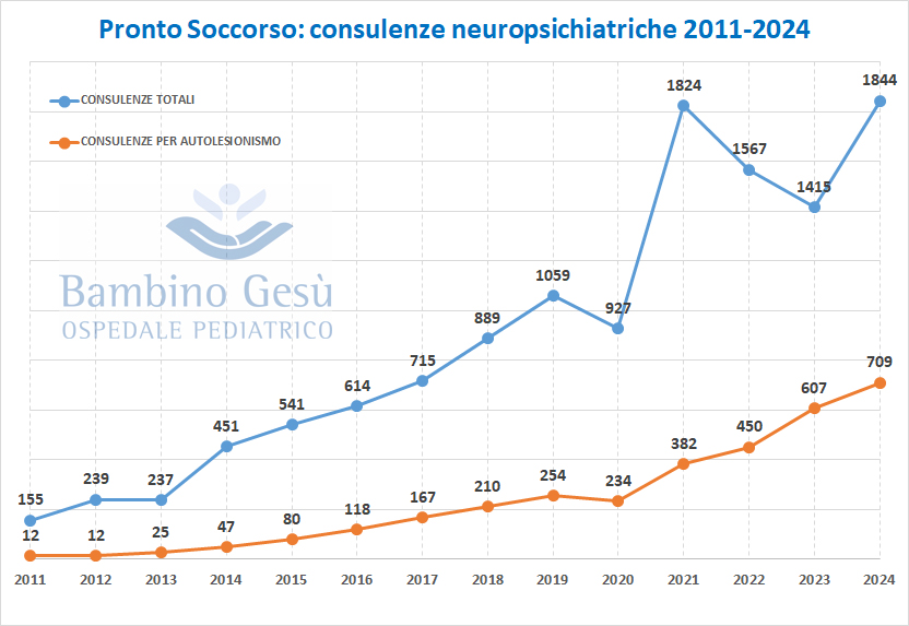 All’Ospedale Pediatrico Bambino Gesù, le consulenze di neuropsichiatria d’urgenza sono cresciute da 155 nel 2011 a 1.844 nel 2024, con un incremento del 1000%.