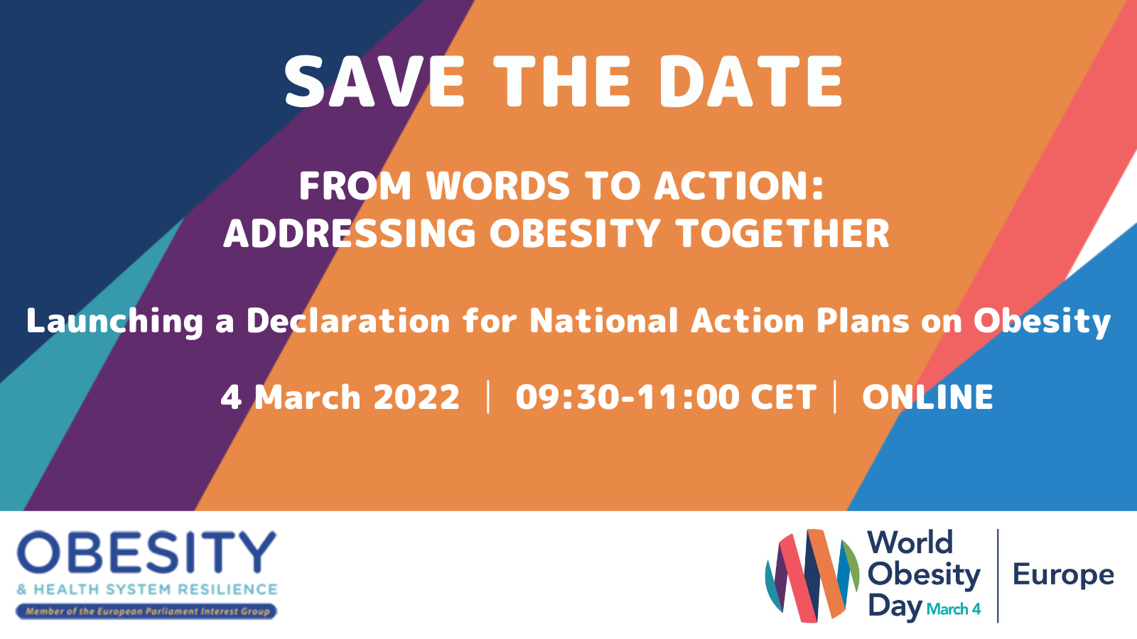 Secondo l'Organizzazione Mondiale della Sanità, l'obesità è una delle più grandi sfide per la salute pubblica del 21° secolo, poiché la sua prevalenza è triplicata in molti paesi europei dagli anni '80. In particolare, l'EASO e l'ECPO vogliono porre l'attenzione sull'impatto che l'obesità ha sulla società e sull'economia e gli enormi vantaggi che ne derivano dalla prevenzione e dal trattamento. Tra le iniziative europee che si terranno in concomitanza con World Obesity Day ci sarà un evento pubblico online ospitato dall'European Parliament MEP sull'obesità e sulla resilienza del sistema sanitario per lanciare la sua Dichiarazione per i piani d'azione nazionali contro l'obesità.