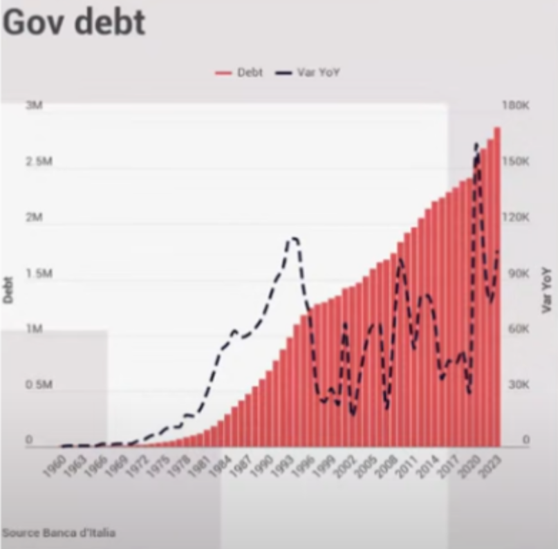 Esiste anche un altro fattore per cui il debito pubblico aumenta, ed è un fattore “meccanico”. Proviamo a semplificare: il debito pubblico è sempre valorizzato a valuta corrente, esattamente come il PIL, questa valorizzazione fa si che il debito aumenta “meccanicamente” in relazione al semplice aumento dei prezzi. Tuttavia, neanche questa dinamica è così importante per l’aumento del debito. Importante, invece, è vedere anno per anno – meglio trimestre per trimestre – le oscillazioni dello stock di debito. Come abbiamo rilevato in apertura, l’oscillazione da novembre a dicembre del 2024 di 30 miliardi è un’oscillazione importante – una legge di bilancio vale circa 30 miliardi -.
