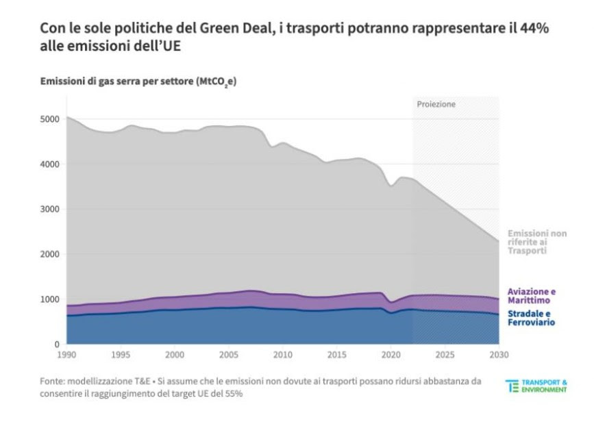 Secondo un recente rapporto di Transport & Environment (T&E), entro il 2030 il 44% delle emissioni nell'UE sarà attribuibile proprio ai trasporti. Questa tendenza all'incremento delle emissioni è preoccupante, poiché il settore si è decarbonizzato tre volte più lentamente del resto dell'economia, mettendo a rischio gli obiettivi climatici dell'Unione Europea.