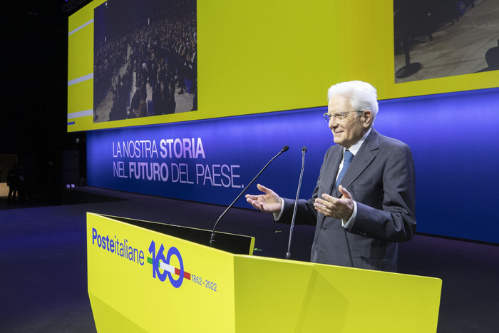Il Presidente della Repubblica Sergio Mattarella a Roma, al Centro Congressi La nuvola, in occasione dell'evento celebrativo del 160° anniversario della fondazione di Poste Italiane
