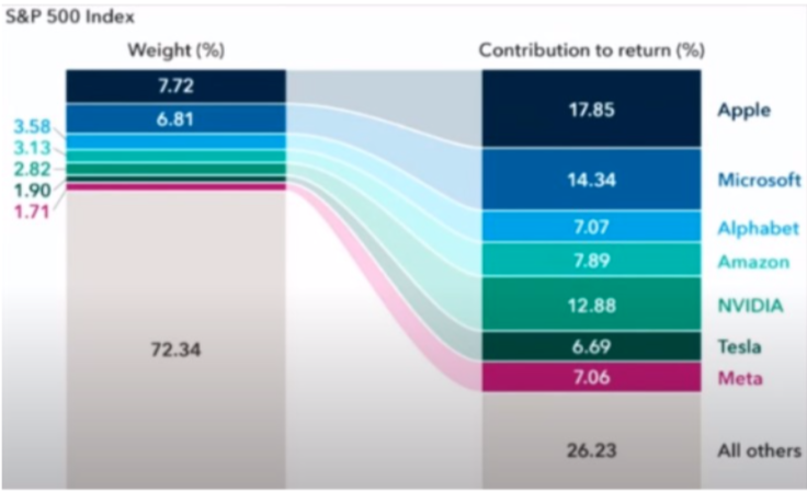 Nella parte destra la percentuale di contribuzione alla performance dell’indice S&P500, nella colonna di sinistra il loro peso all’interno dell’indice. Qualora nessuno avesse mai sentito parlare dell’indice HHI (Herfindahl-Hirschman Index) questo misura l’equa ponderazione di un indice (o anche di un portafoglio privato di titoli). Calcolando tutte le aziende all’interno del S&P500, l’HHI ci dice il numero effettivo di azioni dentro l’indice. L’ultima rilevazione trovata dallo scrivente risale al 2023 e l’indice mostra 60. Significa che l’indice S&P500 è così concentrato in poche aziende che i dati forniti corrispondono a un portafoglio di soli 60 titoli equamente ponderati; contro ogni principio fondamentale della diversificazione!