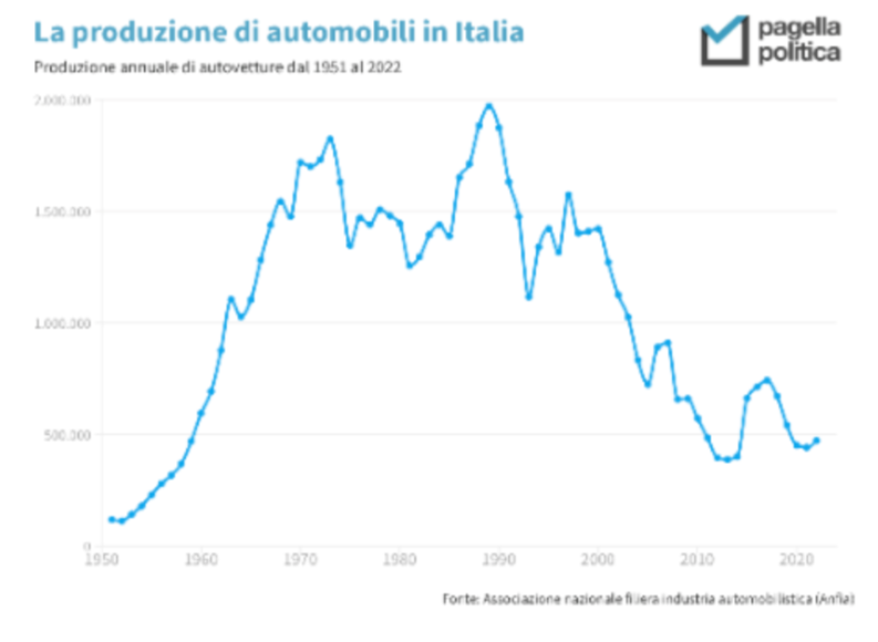 Negli ultimi 30 anni prima Fiat, poi FCA e Stellantis, hanno ricevuto aiuti totali da parte dello Stato italiano per 20 miliardi di euro, nonostante tutto la produzione è in costante calo, lontanissimi dal numero record che sfiora le 2 milioni di unità prodotte del 1989.