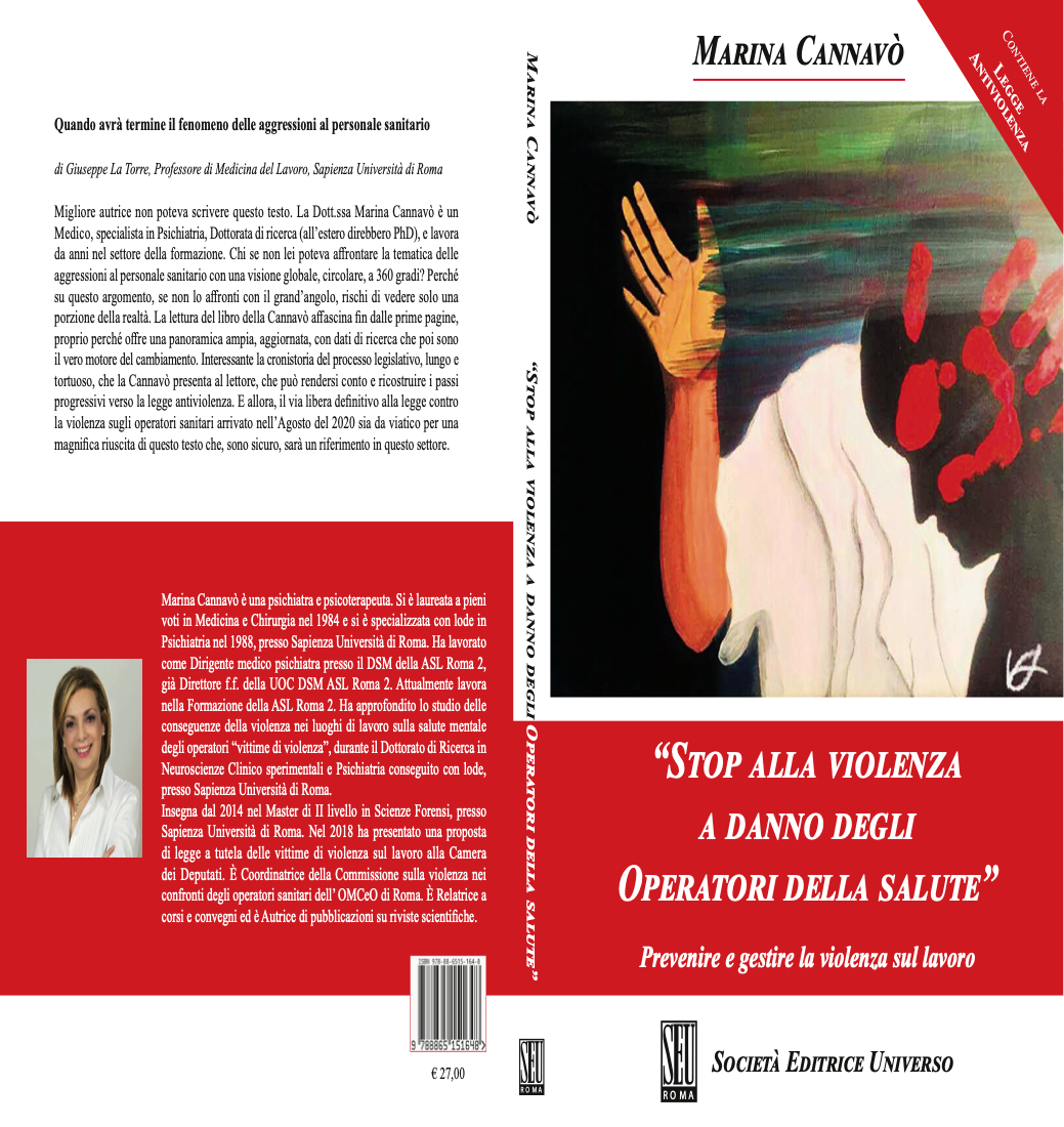 La Dr.ssa Marina Cannavò, Medico, specialista in Psichiatria, psicoterapeuta e Dottorata di Ricerca in Neuroscienze Clinico sperimentali e Psichiatria presso Sapienza Università di Roma, è Autrice del libro “Stop alla violenza a danno degli operatori della salute. Prevenire e gestire la violenza sul lavoro”, pubblicato dalla Società Editrice Universo ad Ottobre 2020. Il libro, che vede la prefazione del Dr. Filippo Anelli, Presidente della Federazione Nazionale degli Ordini dei Medici-Chirurghi ed Odontoiatri (FNOMCeO) e la postfazione del professor Giuseppe La Torre, Docente di Medicina del Lavoro, Sapienza Università di Roma, è dedicato a tutti gli operatori sanitari, agli amministratori e ai comuni cittadini. Nel testo l’Autrice affronta il fenomeno della violenza sul lavoro, chiarendo i significati dei termini aggressività, aggressione e violenza sul lavoro, le diverse forme di violenza, le teorie alla base del fenomeno, i fattori di rischio predittivi di violenza e di stress, con le linee guida e gli interventi da effettuare per prevenire e gestire la violenza sul lavoro, lo stress e le patologie psicologiche e psichiatriche correlate. Infatti nella ricerca che la Dr.ssa Cannavò ha condotto in un Dipartimento di Emergenza di un ospedale romano è stata confermata la diffusione della violenza e la presenza di conseguenze sul benessere e sulla salute mentale del personale sanitario e sociale. La violenza è sempre un trauma, anche nei casi di violenza psicologica, e molti operatori sanitari hanno dichiarato di ricorrere all’uso di psicofarmaci, soprattutto benzodiazepine ed antidepressivi, per sedare la loro ansia e la loro depressione, senza alcuna prescrizione medica da parte di uno specialista in psichiatria e l’associazione con il necessario percorso psicoterapeutico. Purtroppo ancora oggi c’è un pesante stigma sociale nei confronti delle malattie mentali ed i cittadini in generale, e gli operatori sanitari in particolare, hanno spesso timore e vergogna di rivolgersi agli psichiatri, considerati i “medici dei matti”. Ma l’assunzione degli psicofarmaci in assenza di una diagnosi precisa e di un percorso specialistico con terapie farmacologiche e psicoterapeutiche appropriate, rappresenta un serio pericolo per gli operatori, a rischio di cronicizzare il loro malessere, oltre che una grave minaccia per i Cittadini. La Dr. ssa Cannavò, alla luce dei risultati ottenuti, sottolinea che la violenza è il più importante fattore predittivo di disturbi psicologici e psichiatrici come lo stress, il burnout, il disturbo da stress post-traumatico, i disturbi d’ansia ed i disturbi depressivi e propone, dunque, un modello di intervento integrato e multidimensionale, che agisca sulla prevenzione e gestione della violenza e dello stress correlato.