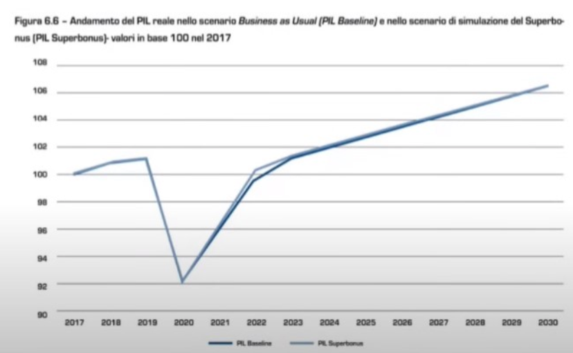 Nel 2021 la crescita aggiuntiva del PIL è stata dello 0,24 per cento, nel 2022 dello 0,68 per cento e poi a decrescere stabilizzandosi in una previsione di crescita nel 2030 dello 0,03 per cento. Tuttavia, i costi sono nell’ordine del 2 per cento del PIL – più o meno – per ogni anno. In sintesi, questo è il meraviglioso “moltiplicatore” del PIL!