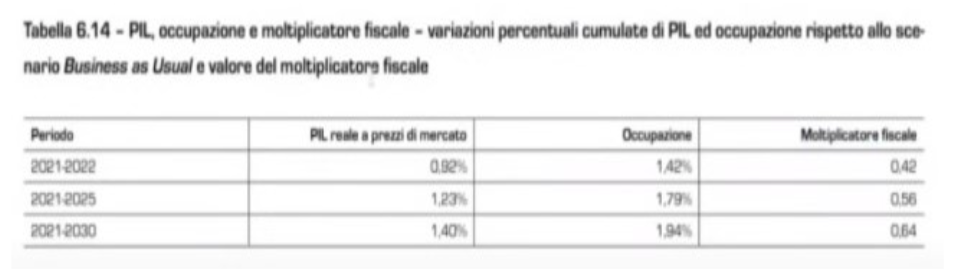 Cumulando tutto il periodo (2021 – 2030) la crescita totale aggiuntiva del PIL (non media annua) è del 1,40 per cento, occupazione +1,94 per cento e moltiplicatore fiscale totale 0,64 per cento. Quello che emerge a un occhio esperto - quindi non al pubblico costretto a seguire dibattiti televisivi senza gli strumenti per elaborare le informazioni ideologicamente riportate dai diretti interessati – è che l’occupazione è salita piùdella crescita del PIL, questo significa che la nuova occupazione è a basso valore aggiunto; in sintesi un’occupazione a bassi stipendi, bassa professionalità e sicuramente non strutturata (leggi: a breve questi occupati saranno tutti nuovamente a spasso con aggravio per lo stato di CIG).