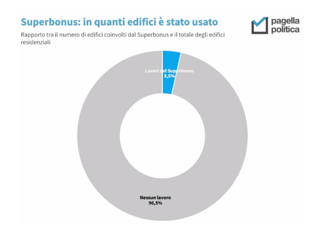 “Secondo i dati più aggiornati dell’Agenzia nazionale per le nuove tecnologie, l’energia e lo sviluppo economico sostenibile (Enea), al 31 agosto 2023 il Superbonus 110 per cento ha coinvolto oltre 425 mila edifici. Il valore degli investimenti ammessi a detrazione ha raggiunto gli 85 miliardi di euro, di cui l’82 per cento riguarda lavori conclusi” scrive Pagella Politica.